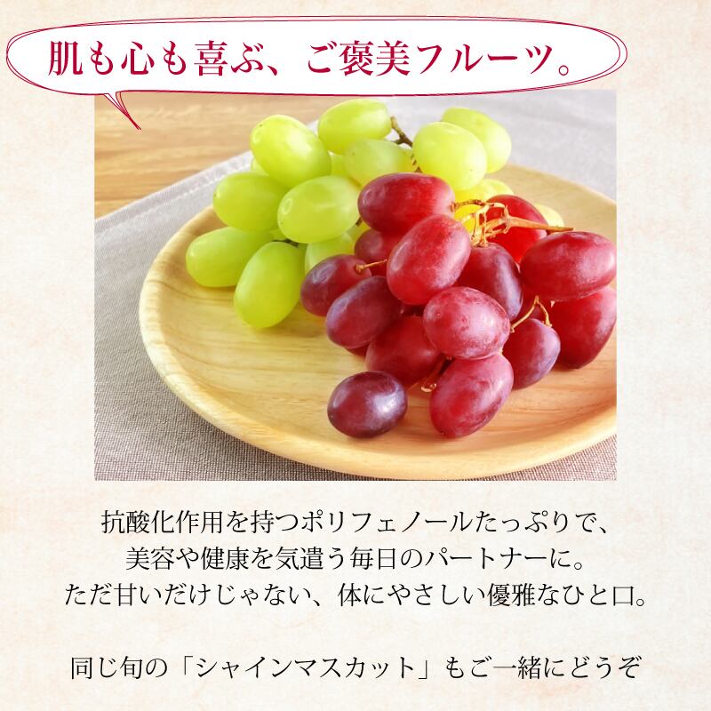 長野県で生まれた品種で、シャインマスカットよりも糖度が高くとてもおいしい皮ごと食べられるぶどうです。